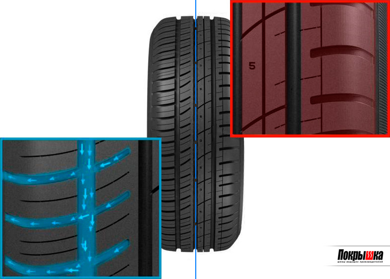Наличие индикатора износа позволяет визуально контролировать остаточную глубину протектора и состояние покрышки. Рисунок является асимметричным: он проектировался на компьютере и имеет две четко выраженные части. Одна из них эффективно сопротивляется аквапланированию, другая — обеспечивает предсказуемость и управляемость машины при маневрировании, в том числе — при скоростном прохождении поворотов.