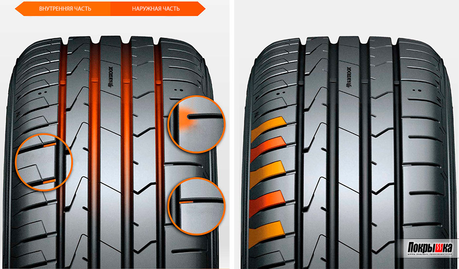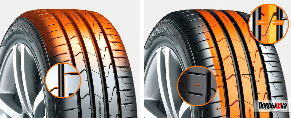 Hankook Ventus Prime 3 K125 имеет короткий тормозной путь благодаря расширяющимся канавкам (слева)и индикатор износа (справа)