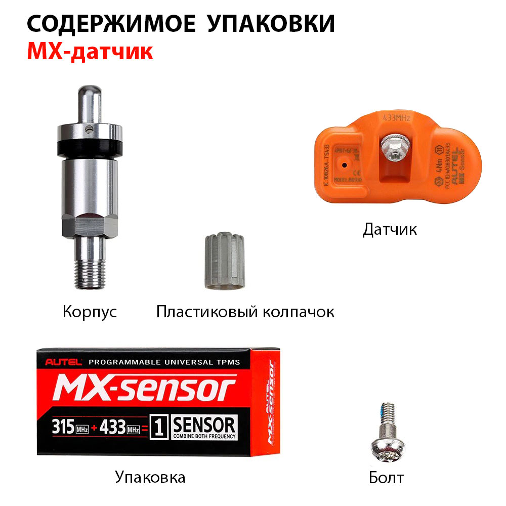 В процессе установки корпус устройства соединяется винтом со стержнем клапана, в большинстве случаев под углом 30 градусов. В комплект поставки, помимо датчика Autel Metal AU11007, входит также пользовательское руководство и фиксирующий штифт.