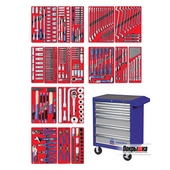 Данный набор размещен в синей тележке из листовой стали с ударопрочным порошковым покрытием. Съемные полки, выдерживающие нагрузку до 20 килограмм, удобно выдвигаются и обеспечивают быстрый доступ к необходимым инструментам. Каждая полка имеет клавишный замок и бирки для описания. Также тележка имеет пару поворотных колес с блокиратором вращения и удобную ручку-карман.