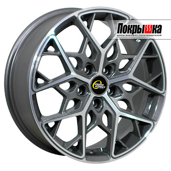 - Яркое дизайнерское исполнение. Рисунок представляет собой орнамент. Он составлен из десяти тонких, пересекающихся в нижней части Y-образных лучей, которые расположены на двух уровнях. Лучи, находящиеся в углублении, выкрашены в темно-серебристый цвет, а остальные отполированы до блеска. Благодаря контрастному цветовому сочетанию диски смотрятся эффектно и стильно, отличаясь визуальной легкостью и изяществом. Машина на таких колесах сразу выделяется в общем транспортном потоке.