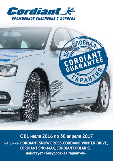 При покупке зимних моделей шин Cordiant: Polar SL, Winter Drive, Sno-Max и Snow Cross, автоматически действует «Безусловная гарантия» от Cordiant с 1.07.2015 по 30.04.2017.