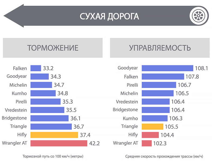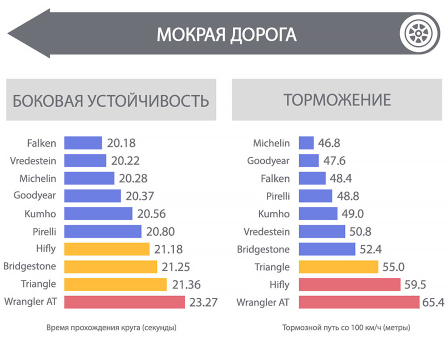 Летняя шина Goodyear Eagle F1 Asymmetric 6 уверенно подтверждает статус эталона безопасности на мокрой поверхности, получая высшую оценку «очень хорошо». Ее сцепные свойства и эффективность торможения оказались лучшими среди всех протестированных моделей. На этом фоне итоги выступления внедорожной модели Goodyear Wrangler All-Terrain Adventure выглядят печально: в тесте на мокром асфальте она показала крайне неутешительный результат, продемонстрировав тормозной путь в 65,4 метра — на 37% больше, чем у ее «дорожной» сестры по бренду. В реальных условиях это означает, что автомобиль с такими шинами остановится примерно на три корпуса позже. Примечательно, что даже доступная по цене модель Hifly смогла показать лучший результат, остановившись на целый корпус раньше.