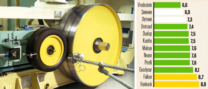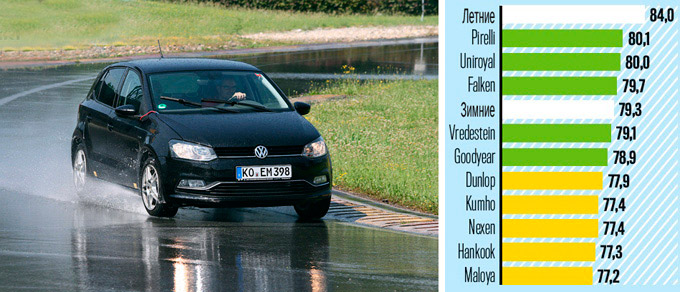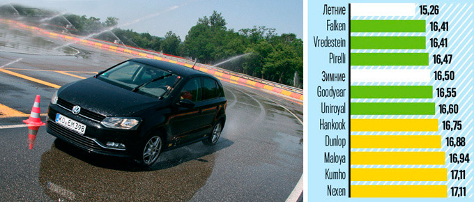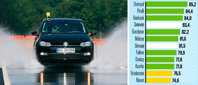 Проверка эффективности торможения на влажном асфальте осуществлялась со стартовой скорости 80 км/ч. Выяснилось, что летний комплект способен остановить машину через 47,9 м. Среди всесезонных моделей лучшими оказались колеса от Falken (51 м) и Uniroyal (51,6 м).