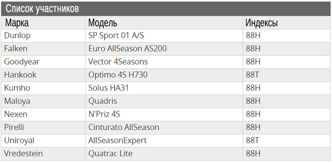 Интересные испытания провели эксперты Auto Bild — одного из самых авторитетных в Германии автомобильных журналов. Тест был организован с целью получения ответа на вопрос: действительно ли всесезонная резина не может являться полноценной заменой зимним и летним покрышкам? Для испытаний было отобрано 10 всесезонных комплектов в типоразмере 185/60 R15, а для наглядного сравнения показателей к ним добавили одну летнюю и одну зимнюю модель. Все покрышки, участвовавшие в тесте, приобретались в свободной продаже. В результате выяснилось, что ни одна шина не может считаться идеальной, а для выбора подходящего комплекта необходимо принимать во внимание особенности предстоящей езды.