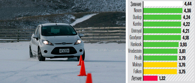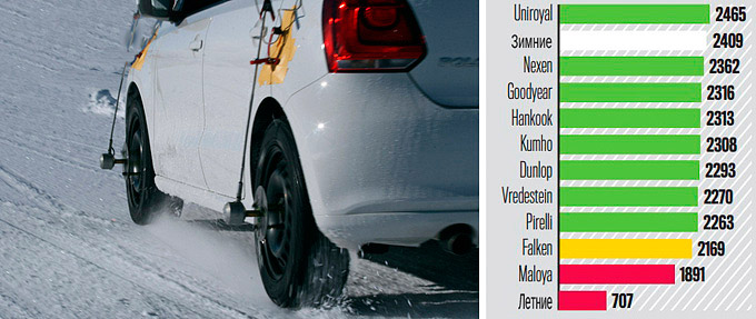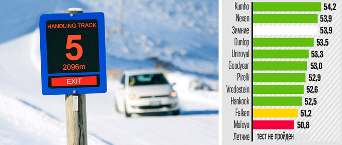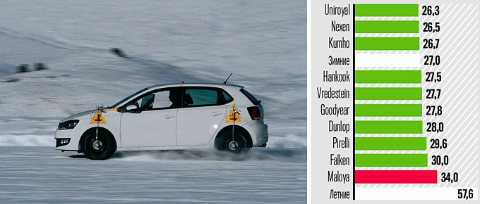 Аутсайдерами стали шины Nexen и Maloya, показавшие результат соответственно 55,2 и 56,2 м. Что касается зимнего комплекта, то его дистанция торможения составила 53 метра.
