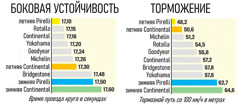В тестах на устойчивость к аквапланированию лучше всех зарекомендовал себя всесезонный комплект от Continental. Но летние шины от этого же производителя выступили на критически плохом уровне.