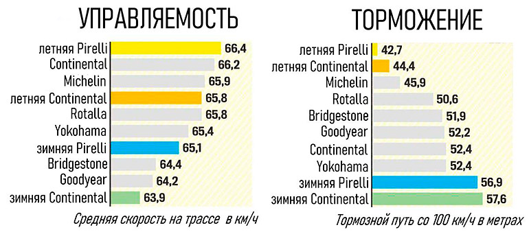 Что касается показателей управляемости, то здесь то здесь лучшими стали покрышки от Goodyear, Michelin и Bridgestone. Неплохие показатели были зафиксированы также у «всесезонок» от Continental и Rotalla. Летний комплект от Pirelli совершенно не держит трассу, машина быстро уходит в занос.