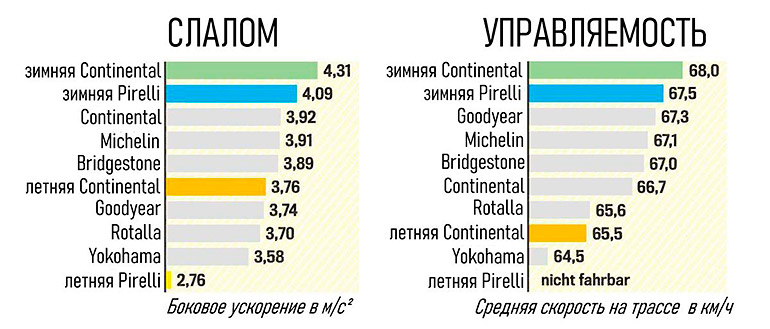 В тестах на управляемость лучше других участников зарекомендовали себя шины от Michelin и Continental. В вот покрышки Goodyear и Bridgestone выступили неубедительно и уступили в данной номинации даже зимней резине.