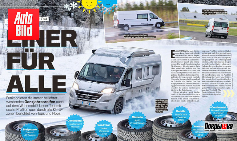 Всесезонные шины избавляют от необходимости покупать второй комплект резины и регулярно тратиться на «переобувание» автомобиля. Насколько подходят такие покрышки для легкогрузового коммерческого транспорта (небольших автофургонов, маршруток, малотоннажных грузовиков), решили выяснить эксперты немецкого автомобильного издания Auto Bild reisemobil. Для испытаний отобрали шесть комплектов «всесезонки», и по два комплекта летних и зимних шин — для наглядности сравнения. Заезды проводились на трех полигонах: шведских Arctic Falls и Drivecenter Arena, а также на итальянской площадке, принадлежащей концерну Pirelli. Тестовые автомобили — фургон Fiat Ducato и кемпер Etrusco SV 600 DB.