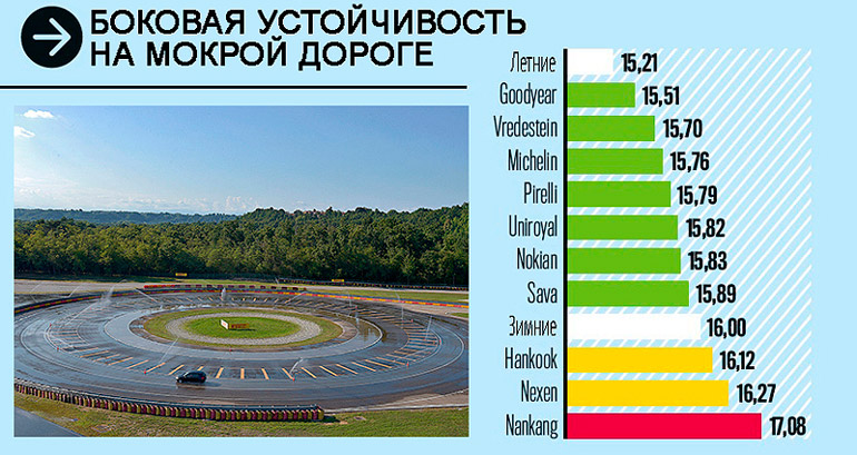 Максимальные показатели бокового ускорения были зафиксированы у комплектов от Nankang и Uniroyal. Они выступили даже успешнее, чем зимние шины. Хуже остальных в данной номинации результаты оказались у покрышек Pirelli и Goodyear.
