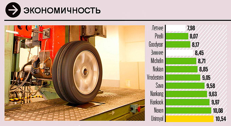 Сопротивление качению измерялось с помощью специального стенда. Лучший результат был зафиксирован у летнего комплекта, а среди всесезонных покрышек победителями стали Pirelli и Goodyear. Аутсайдер номинации — шины от Uniroyal.