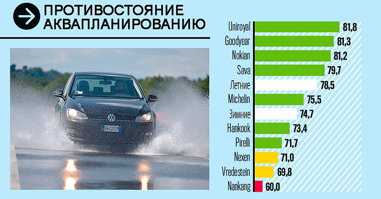 В данном испытании производился замер скорости, при достижении которой шины утрачивают сцепление с мокрым дорожным полотном. Лучше других в данной номинации выглядели комплекты от Uniroyal и Goodyear.