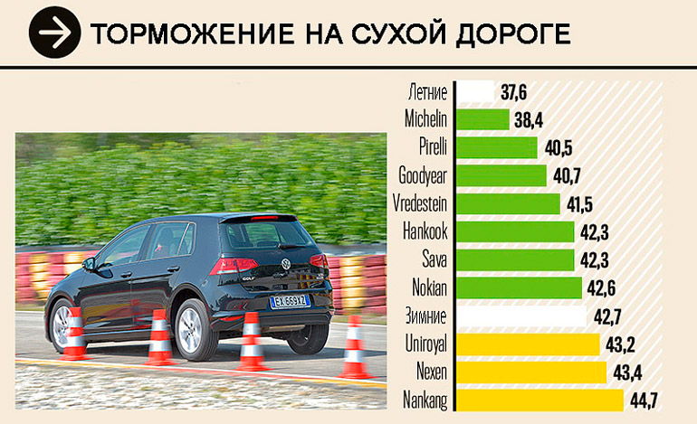 Минимальная дистанция торможения (47,8 м) предсказуемо оказалась у летних покрышек (замеры проводились со стартовой скорости 100 км/ч). Автомобиль на шинах Goodyear смог остановиться через 48,7 м, Pirelli показали результат 51,4 м, а Michelin — 51,5 м.