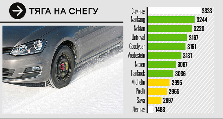 Самые высокие тяговые способности при движении по заснеженному участку тестовой трассы были продемонстрированы зимними покрышками — как, собственно, и предполагалось.