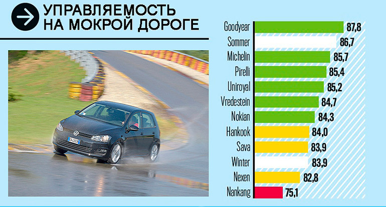 Мокрый круговой участок тестовой трассы быстрее всех прошел автомобиль на шинах Goodyear. С небольшим отставанием на второй позиции оказался летний комплект, далее расположились покрышки Vredestein и Michelin.