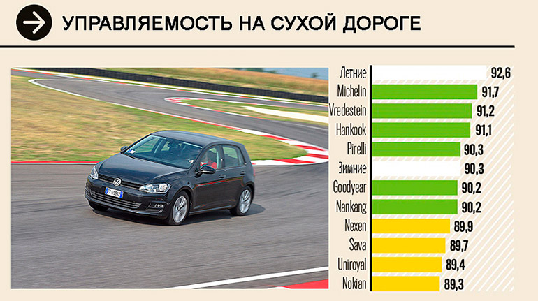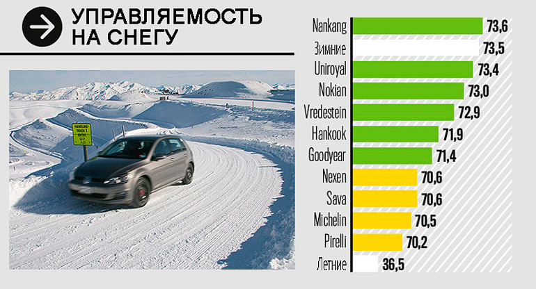 Все комплекты, кроме летних покрышек, продемонстрировали в данной дисциплине достаточно неплохие результаты.