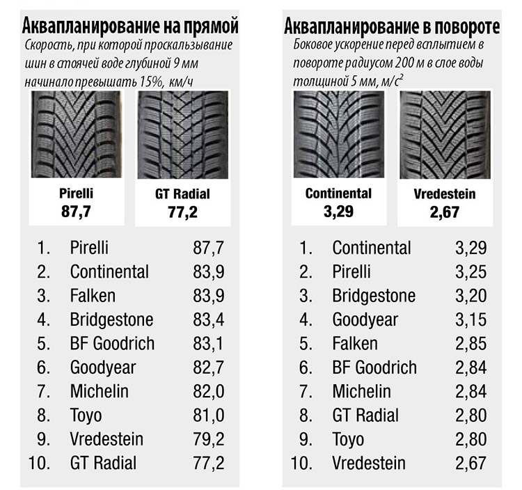 Что касается устойчивости к аквапланированию, то здесь лучший результат был зафиксирован у итальянского комплекта от Pirelli. Также достойно выступили шины от Continental и Bridgestone, ненамного отстали от них покрышки Goodyear и Falken.