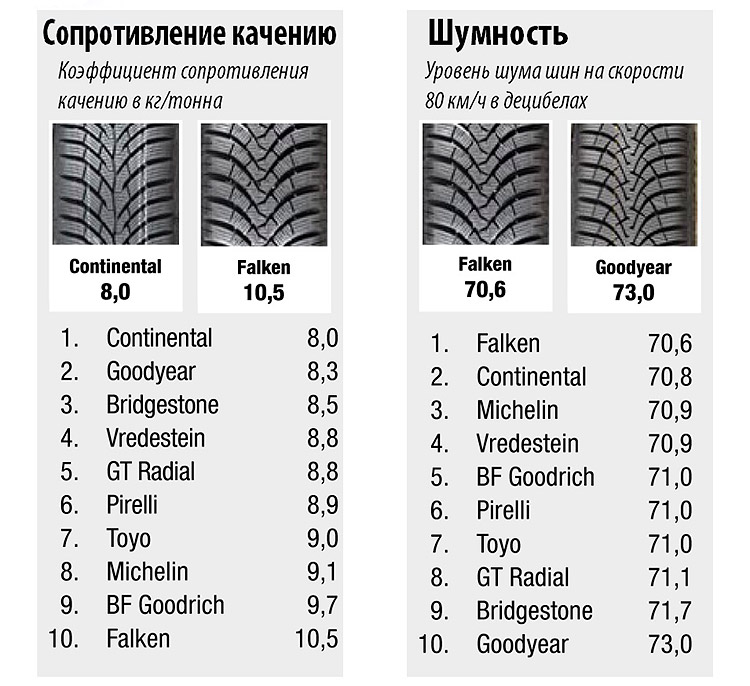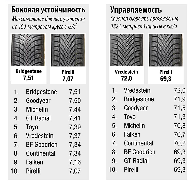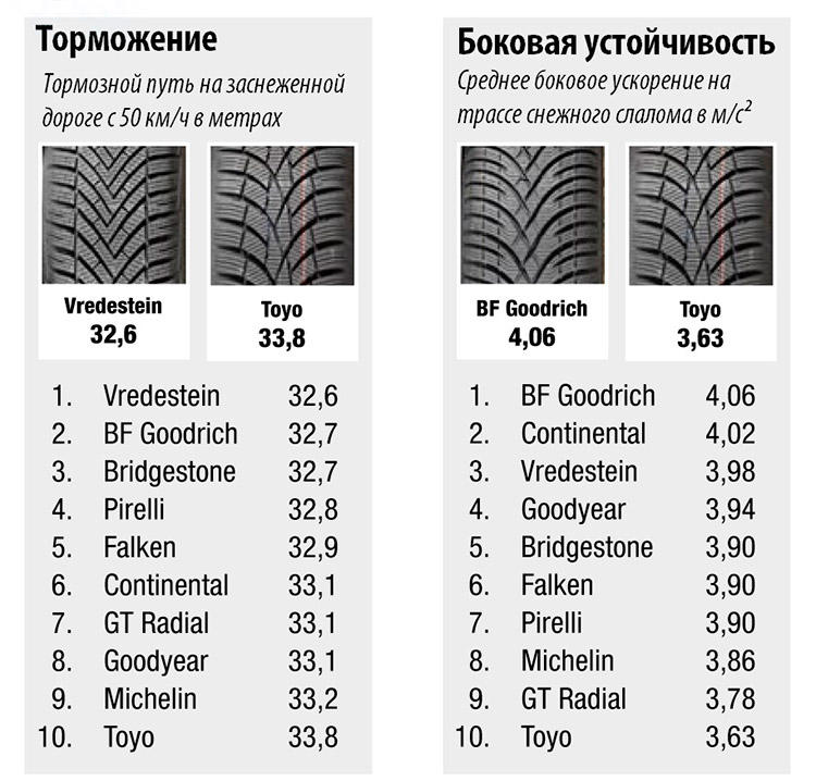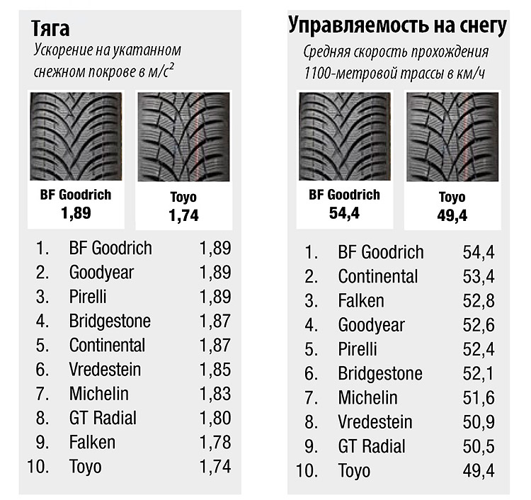 Помимо комплекта от Bridgestone, в мокрых заездах хорошо зарекомендовали себя шины от Vredestein, Continental, Goodyear. Интересно, что самый дешевый участник испытаний — шины от Falken выступили лучше, чем модель премиум-класса от Michelin. Что касается победителей снежных заездов — BFGoodrich и Pirelli, то их пример наглядно демонстрирует, что хорошие сцепные характеристики на заснеженном полотне могут обернуться снижением производительности на влажном покрытии.