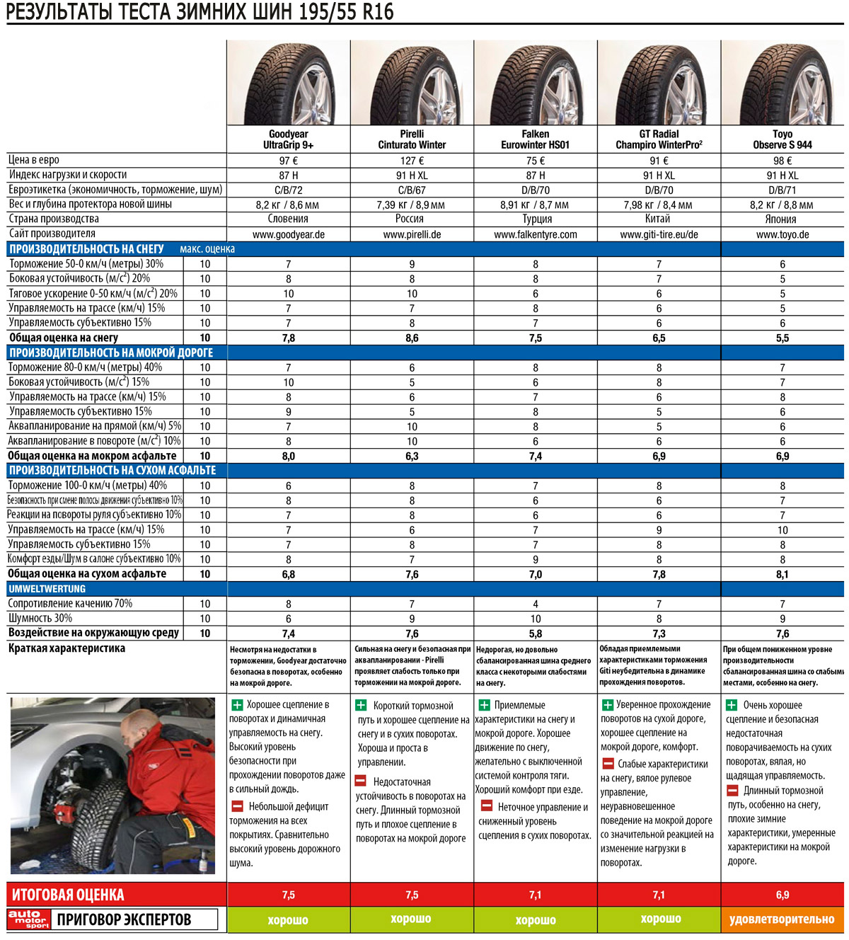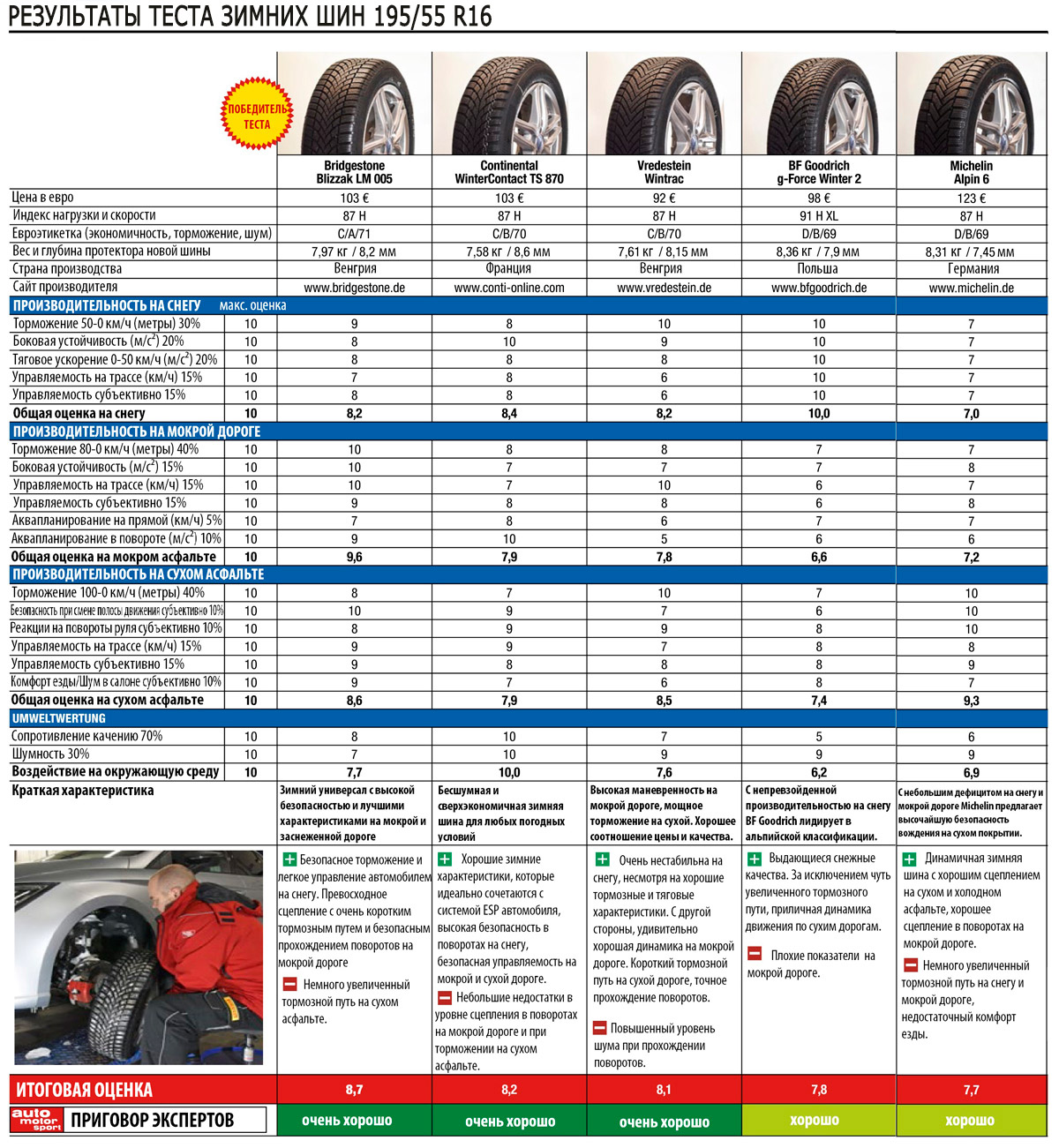 Как полагают эксперты Auto Motor und Sport, им удалось выяснить, какая шина лучше подходит для конкретных условий. Так, для заснеженных регионов оптимальный выбор — комплект от BFGoodrich, для езды по мокрым дорогам рекомендуется приобрести Bridgestone, для движения по сухим холодным трассам — шины Michelin. Если же говорить об универсальной модели для зимней эксплуатации, то по совокупности результатов во всех дисциплинах это покрышки от Bridgestone.
