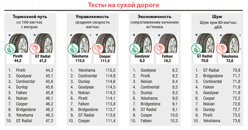 Кроме этого, в лидирующую тройку попали также модели от Dunlop и Goodyear. Примечательно, что покрышки GT Radial в данной номинации сумели обойти некоторых представителей премиум-сегмента. Худшие результаты были зафиксированы у шин Falken и Cooper.