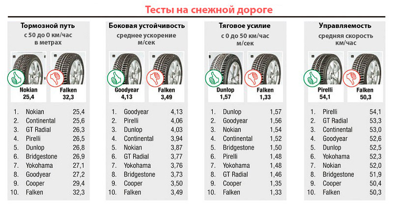 Лучшие тяговые способности были продемонстрированы шинами UltraGrip Performance Gen-1 от Goodyear, SP Winter Sport 5 от Dunlop и WR D4 от Nokian, у которых были зафиксированы почти одинаковые результаты. Неплохо выступили также модели от Pirelli, Yokohama, Continental, Bridgestone и GT Radial.