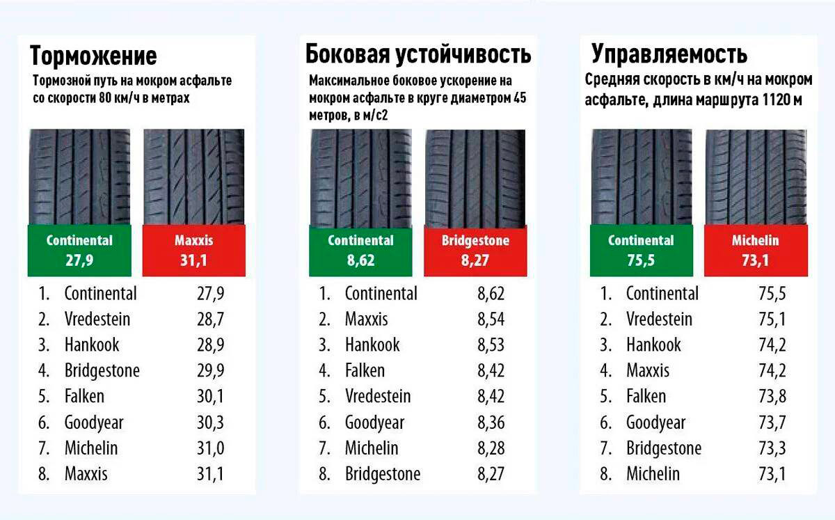 Если сопоставить средний показатель всех индивидуальных результатов торможения (заезды проводились с начальной скорости 80 км/ч), то разница между победителем и аутсайдером номинации составит более 3 м. Этот показатель может показаться несущественным, однако если перевести его на остаточную скорость, то окажется, что в той точке, где победитель теста остановился, автомобиль на шинах-аутсайдерах еще будет двигаться со скоростью 26 км/ч.