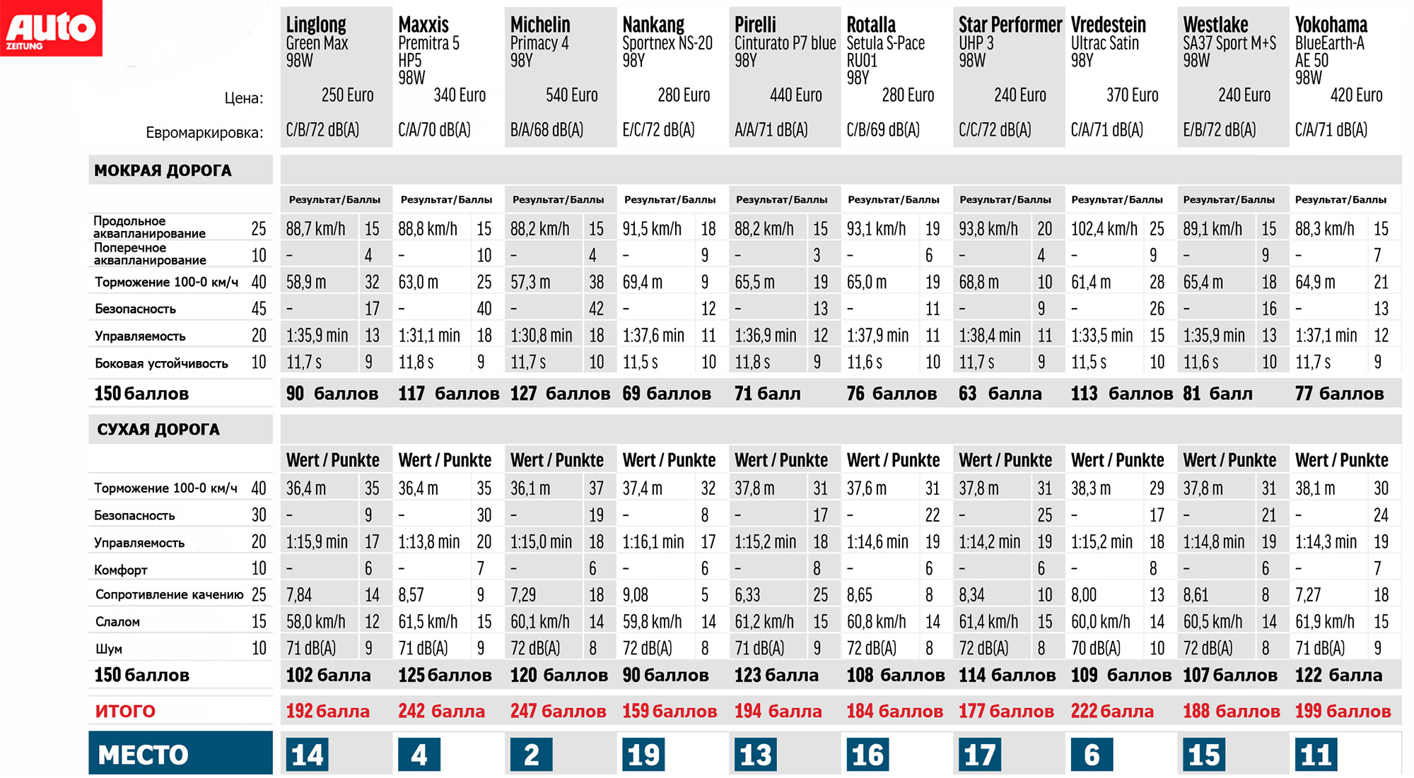 Бюджетная модель LingLong Green Max стоимостью 250 евро за комплект показала отличные результаты в тормозных испытаниях на влажном покрытии, а главным недостатком является низкий коэффициент бокового сцепления.