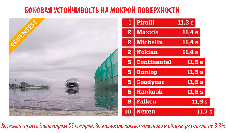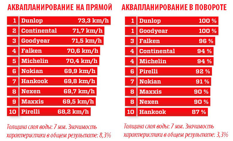 Что касается устойчивости к аквапланированию, то благодаря профилированному протектору победителем данной номинации стали покрышки от Dunlop. Также неплохо выступили шины Goodyear, в то время как комплекты от Pirelli и Hankook показали слабый результат.