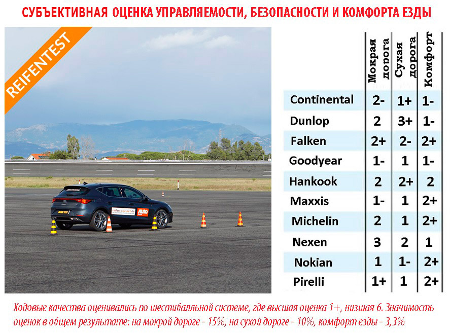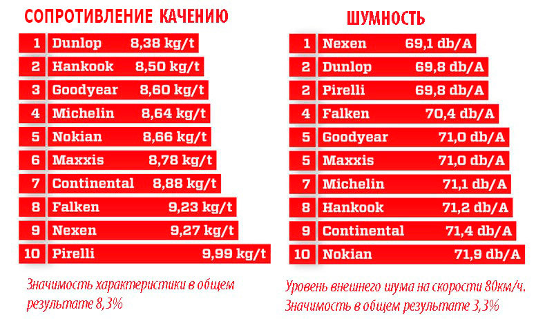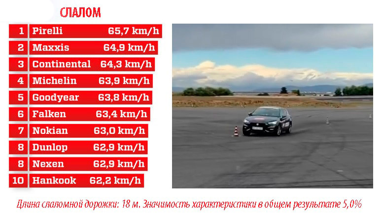 Интересный нюанс: все участники имеют высший показатель сцепления с мокрым покрытием — «А», однако результаты тестов на торможение, которые проводились со стартовой скорости 100 км/ч, были разбросаны в довольно широком диапазоне. Так, победитель номинации Goodyear Eagle F1 Asymmetric 5 остановит тестовый автомобиль на 9 метров раньше по сравнению с аутсайдером дисциплины Hankook Ventus S1 evo3.