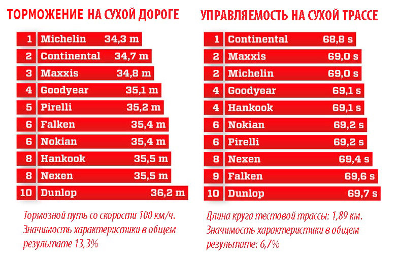 Шины от Hankook и Maxxis показали хорошие результаты в сухих тестах, но уступили конкурентам на мокром покрытии.