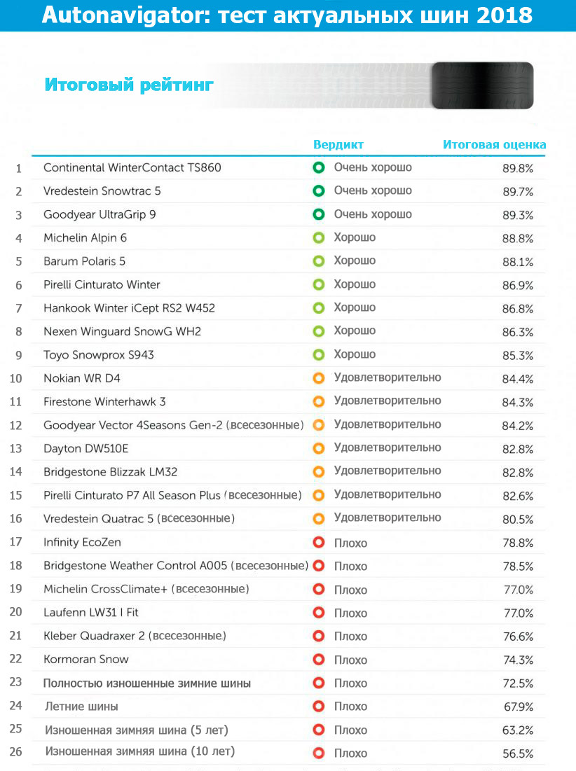 В итоговом рейтинге первенствовала модель Continental WinterContact TS860, получившая отметку «очень хорошо». Аналогичным образом были оценены расположившиеся чуть ниже шины Snowtrac 5 от Vredestein и UltraGrip 9 от Goodyear. Все представители тройки лидеров продемонстрировали оптимальное сочетание характеристик, важных для езды в зимних условиях.