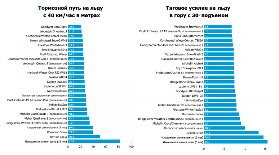 Один из главных выводов, которые сделали эксперты по итогам испытаний, заключается в том, что изношенная зимняя резина непригодна для эксплуатации. Участвовавшие в тестах шины с 5- и 10-летним износом заняли последние места в итоговом рейтинге с оценкой «Плохо».