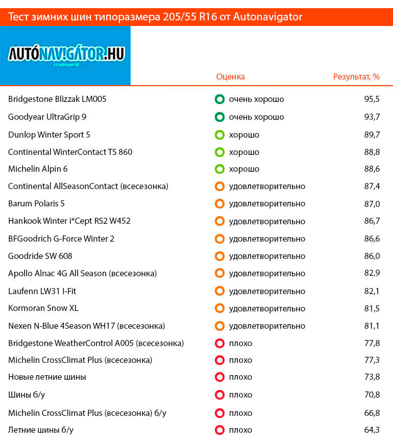 Каждый тест был выполнен пять раз, в зачет пошло среднее значение. По итогам испытаний на пьедестал попали модели Blizzak LM005 от Bridgestone, UltraGrip 9 от Goodyear и замыкает тройку лучших Winter Sport 5 от Dunlop.