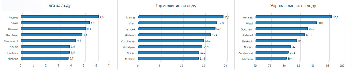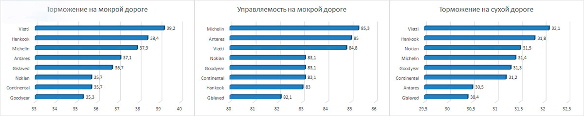Что касается продукции от Gislaved и Goodyear, то, несмотря на хорошие результаты по итогам некоторых заездов, признаны морально устаревшими, что не позволяет им успешно конкурировать с более современными шинами. А бюджетная резина от Viatti и Antares, занявшая две последние позиции, и вовсе вызвала опасение у испытателей.