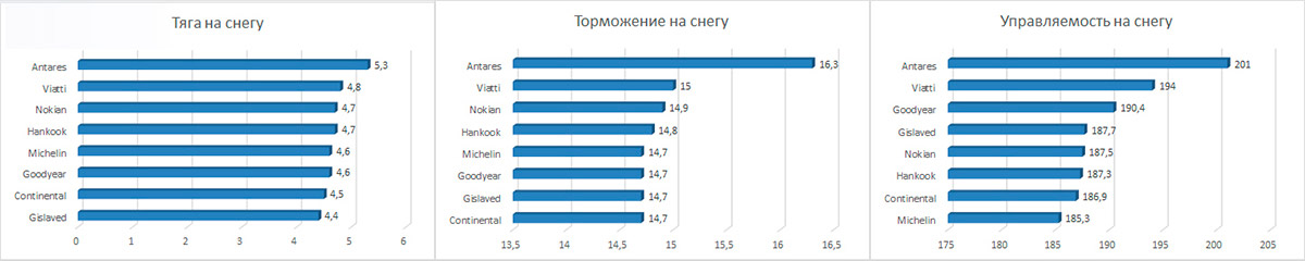 При заездах на заснеженном покрытии шины демонстрируют иные технологии. В частности, обильная ошиповка Michelin позволила занять призовую позицию лишь в испытаниях на управляемость. Показатели торможения и разгона оказались выше у Continental IceContact 3 и Gislaved Nord*Frost 200.