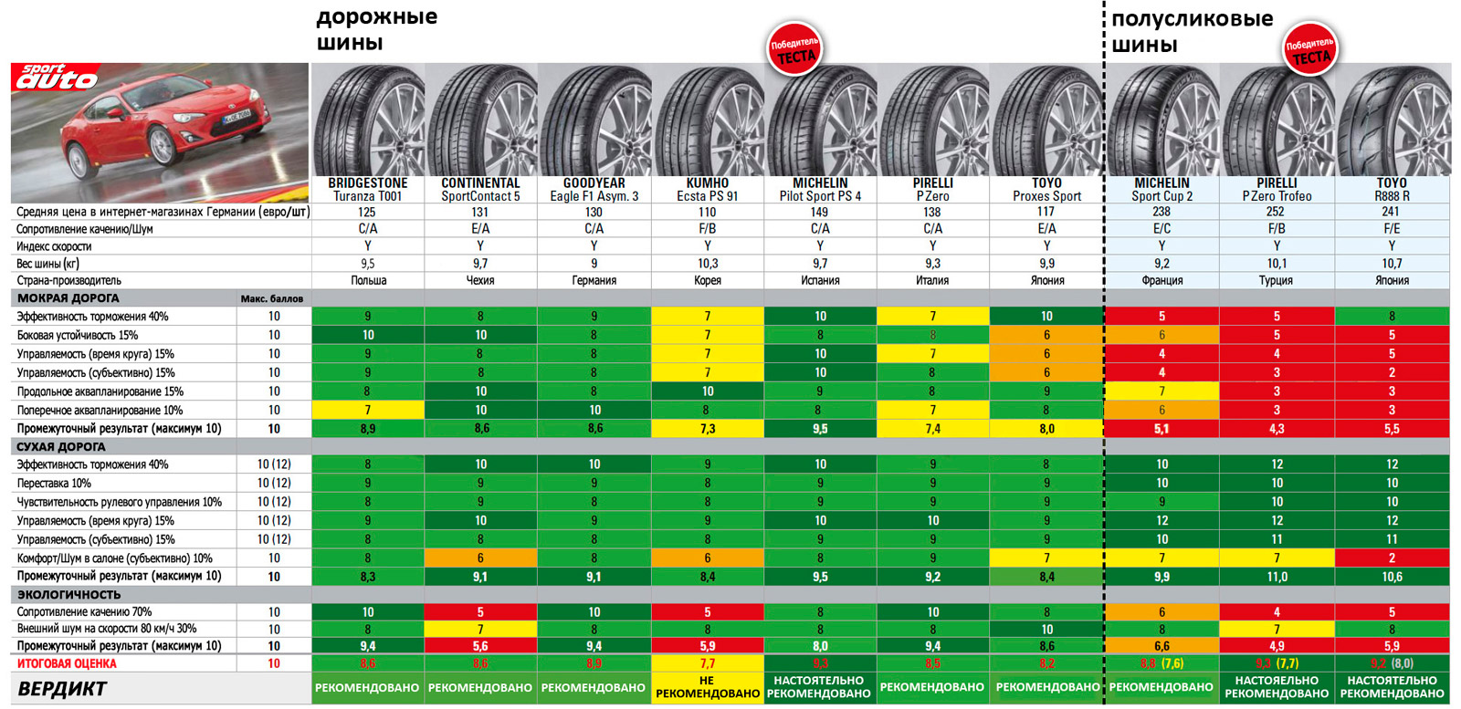Первое место в итоговом рейтинге досталось французским шинам Michelin Pilot Sport 4 — единственному дорожному участнику испытаний, в отношении которого был вынесен вердикт «настоятельно рекомендовано». Данная модель удачно объединила в себе черты комфортной и спортивной авторезины, а также одинаково успешно выступила в сухих и мокрых дисциплинах. Что касается недочетов, то таковыми можно считать повышенное сопротивление качению и шумность.