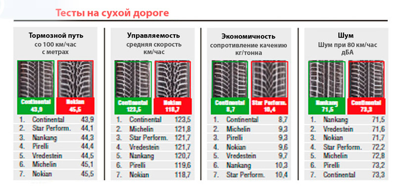Зато в тестах на сухом покрытии шины Nankang показали очень достойный результат, пропустив перед собой лишь покрышки от Continental и Star Performance. Худший результат в данной дисциплине продемонстрировали финские шины от Nokian, проехавшие дальше на 1,6 м по сравнению с лидером.