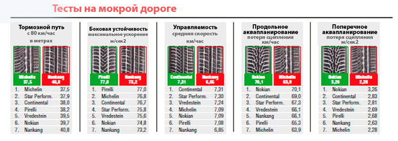 Даже с учетом того, что покрышки Pirelli и Michelin быстрее всех прошли влажный участок управляемости, они показали посредственный результат в тестах на устойчивость гидропланированию. В данной дисциплине недостаточно эффективно выступила также модель Nankang, а лучше всех противостоят гидропланированию финские шины Nokian.