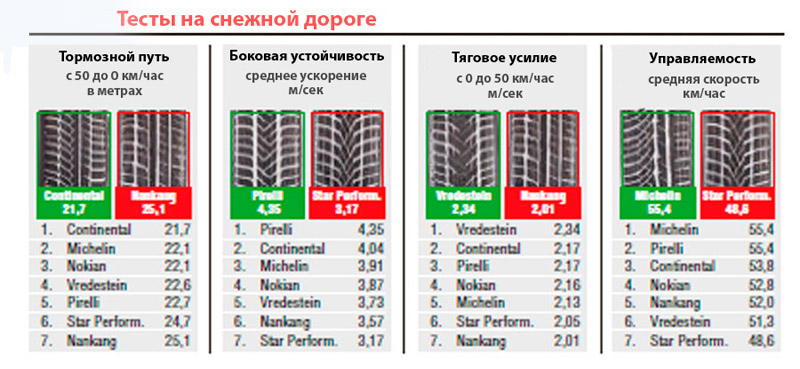 Худшие результаты были зафиксированы у моделей от Nokian, Vredestein и Nankang, которые остановили тестовый автомобиль более чем на 2 м дальше по сравнению с лидером.
