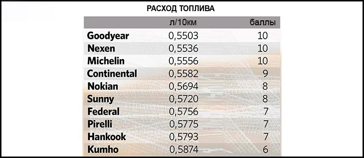 Шины EfficientGrip Performance 2 от Goodyear стали победителями данной номинации, продемонстрировав минимальный (5,503л/100 км) расход топлива. Этот показатель на 3,5% лучше по сравнению с самой неэкономичной моделью от Kumho.