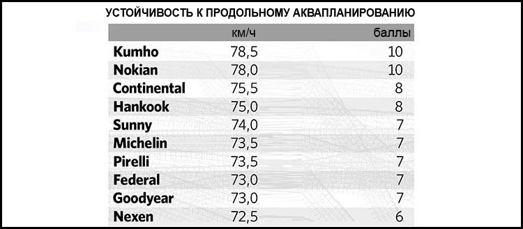 Как показали итоги теста, способность покрышек сопротивляться гидропланированию не зависит от глубины дренажных бороздок. В частности, у победителя данной номинации — покрышек Michelin она составила лишь 6,25 мм, в то время как уступившая французским шинам модель от Goodyear имеет водоэвакуационные каналы глубиной 8,05 мм. Как подчеркнули пилоты, на стойкость к гидропланированию немалое влияние оказывает также состав компаунда и дизайн протекторного рисунка.