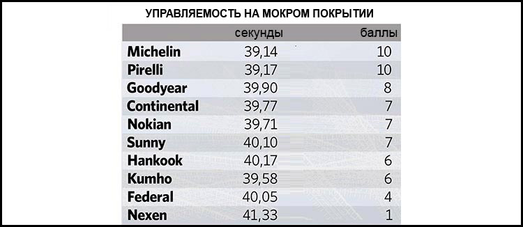 Наиболее высокая скорость на влажном участке управляемости была зафиксирована у покрышек от Michelin и Pirelli. Пилоты подчеркнули, что эти модели отличаются точным откликом на рулевое управление, предсказуемостью, хорошей управляемостью и полным соблюдением заданной траектории.