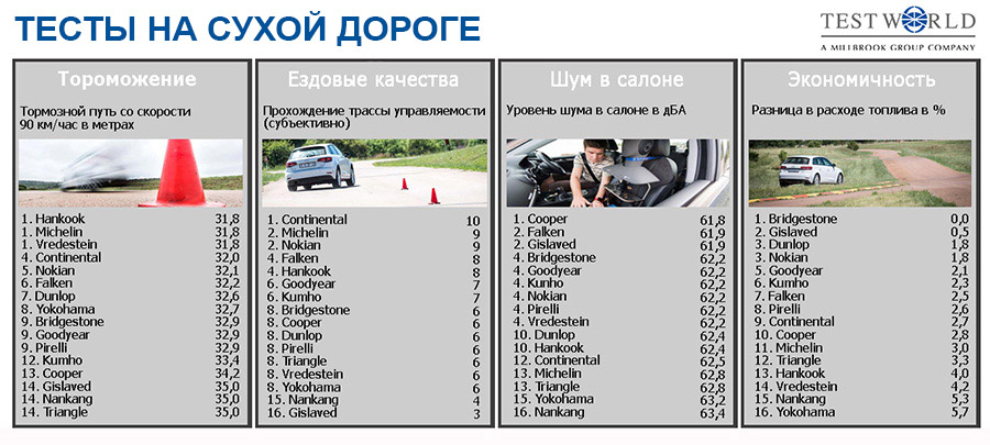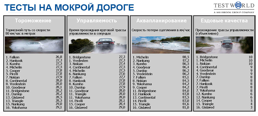 Покрышки Hankook и Kumho показали неплохую эффективность торможения на влажном асфальте, но оказались неубедительными с точки зрения устойчивости к аквапланированию и в целом продемонстрировали посредственное сцепление с мокрой дорогой. Недешевые комплекты от Dunlop и Goodyear оказались склонными к заносу при движении по сухому асфальту, однако продемонстрировали хорошие результаты в мокрых заездах.