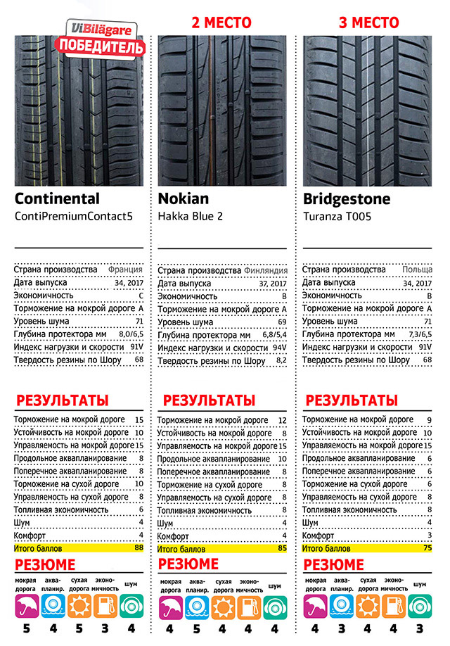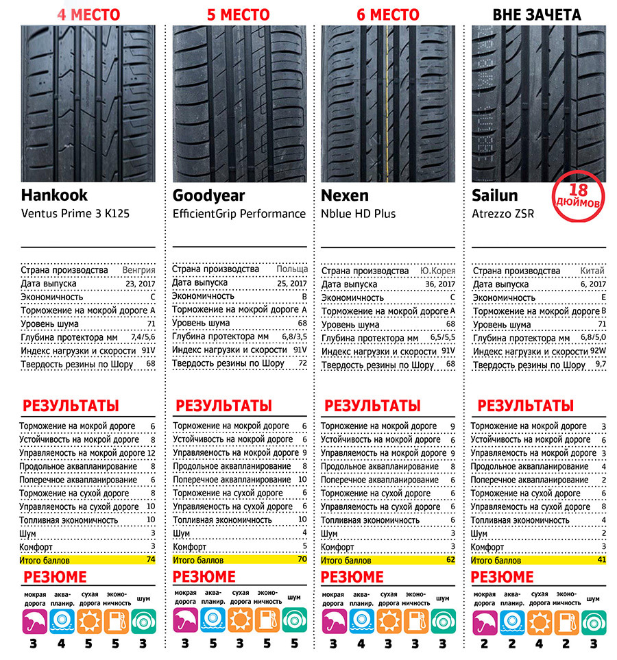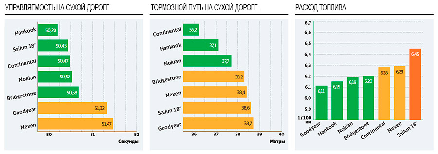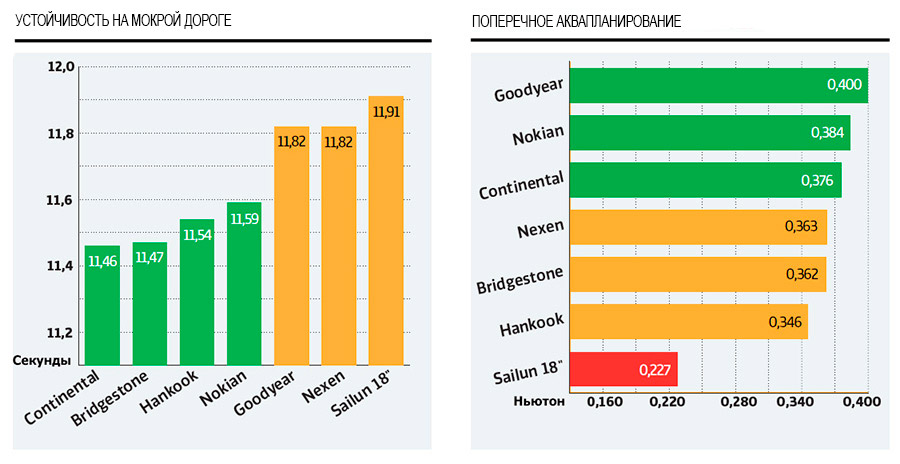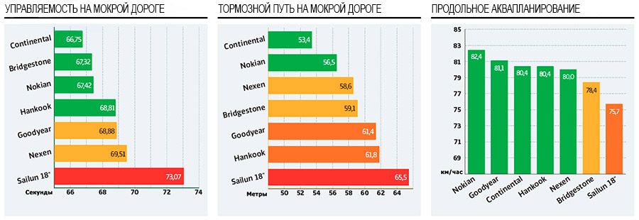 У моделей от Nokian, Continental, Hankook и Bridgestone была зафиксирована лучшая устойчивость на влажном асфальте. В испытаниях на сопротивляемость аквапланированию победителями стали комплекты от Continental, Goodyear и Nokian. У 18-дюймового китайского комплекта Sailun были зафиксированы провальные показатели стойкости к боковому гидропланированию.