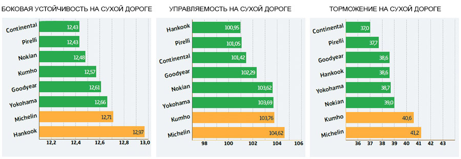 Лучшими на круговом треке оказались покрышки от Continental, Pirelli и Nokian. Последние позиции заняли шины от Michelin и Hankook, которые быстро соскальзывали с заданной траектории при прохождении поворотов.