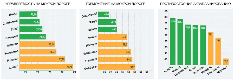 Известно, что лучшие показатели в заездах по мокрому дорожному покрытию обычно демонстрируют покрышки премиальных брендов — Goodyear, Pirelli, Continental, Bridgestone и Nokian. Стоит отметить, что финский концерн Nokian попал в этот перечень сравнительно недавно: изначально этот производитель специализировался на зимней резине (что во многом обусловлено спецификой скандинавского климата), но впоследствии за непродолжительный период времени освоил выпуск летних шин.