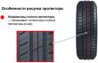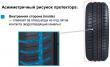 Наличие индикатора износа позволяет визуально контролировать остаточную глубину протектора и состояние покрышки. Рисунок является асимметричным: он проектировался на компьютере и имеет две четко выраженные части. Одна из них эффективно сопротивляется аквапланированию, другая — обеспечивает предсказуемость и управляемость машины при маневрировании, в том числе — при скоростном прохождении поворотов.