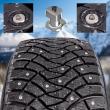 - Инновационная система ошиповки, реализованная совместно с производителем шипов — компанией Sumitomo. Данные шипы изготовлены по технологии Anti-Tilt, они легко входят в контакт со льдом за счет скошенного сердечника и двух острых зубцов, надежно защищены от вырывающих воздействий и практически не наносят вреда дорожному покрытию.