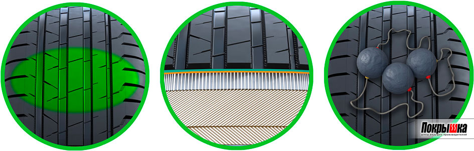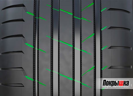 Особым преимуществом является минимальная шумность, достигнутая благодаря технологии Silent Groove. Ее сущность заключается в особой конфигурации стенок радиальных ребер, покрытых полукруглыми углублениями. Благодаря этому воздушный поток плавно обтекает поверхность, что снижает аэродинамические резонансы и способствует охлаждению шины.